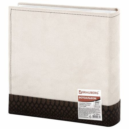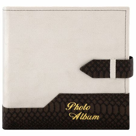 Состоит из 50 бумажных листов размером 15,5х21 см с карманами и вмещает 200 фотографий размером 10х15 см по 2 штуки на странице. Обложка фотоальбома скомбинирована из материалов под кожу рептилии и замшу контрастных коричневого и бежевого цветов, которая украшена регулируемой по длине застежкой. Фотоальбом с книжным переплетом отличается повышенной прочностью и долгим сроком службы. Размер - 20,7х21,8 см.